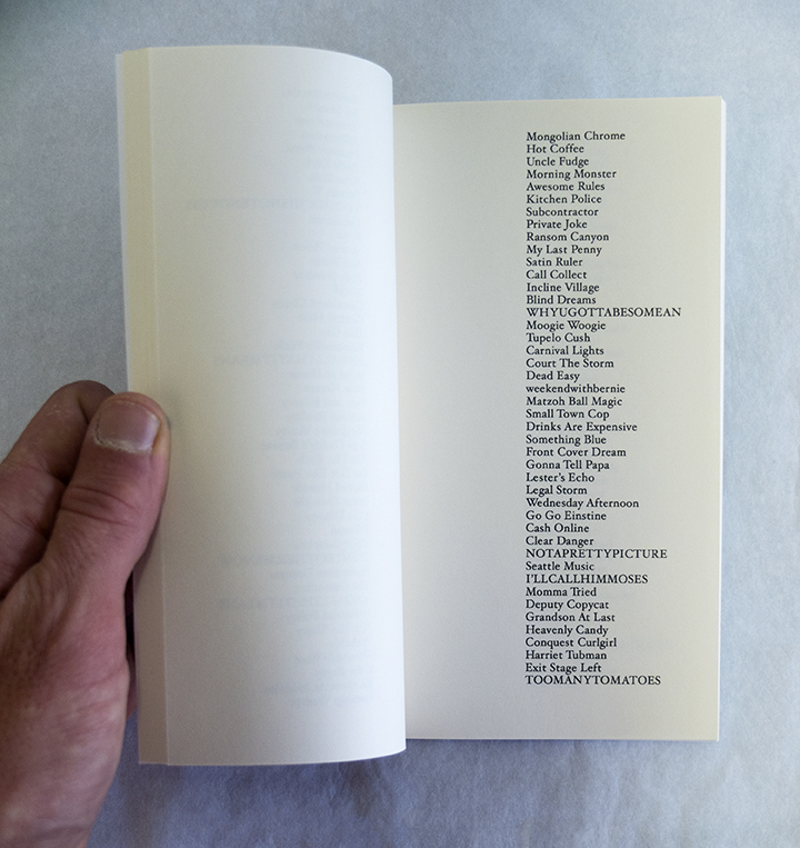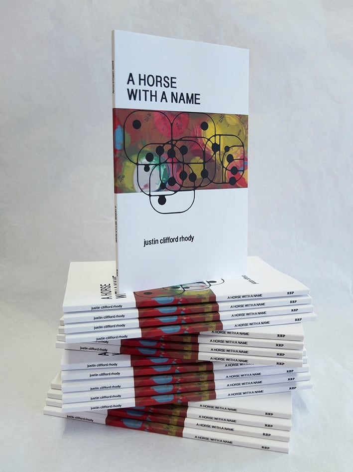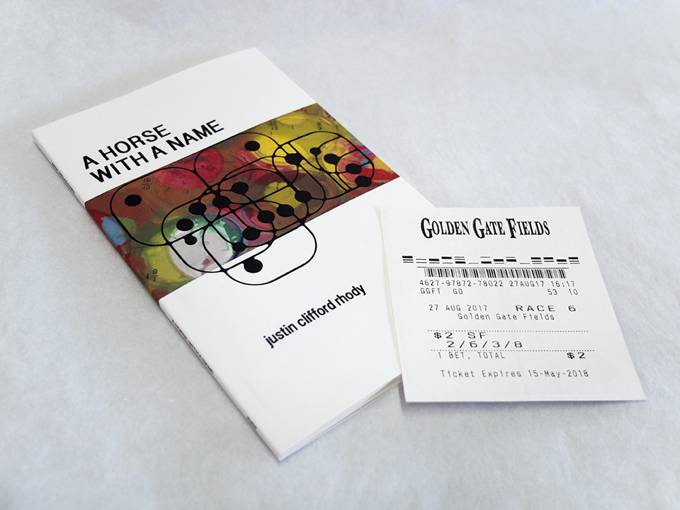 "How do we name the things we must surmount? Or, more difficult, how do we coin sobriquet for what we’ve sent to conquer the land? What follows is a sport of language, one that has entertained conquistador, gambler, poet and common man since 4500 BC. Artist and poet Justin Clifford Rhody continues his aesthetic investigation of the American West with this installment of found-language, compiled from the littered racing programs collected during the artist’s time spent amidst the bright, dusty bleachers of California’s extant race horse tracks.